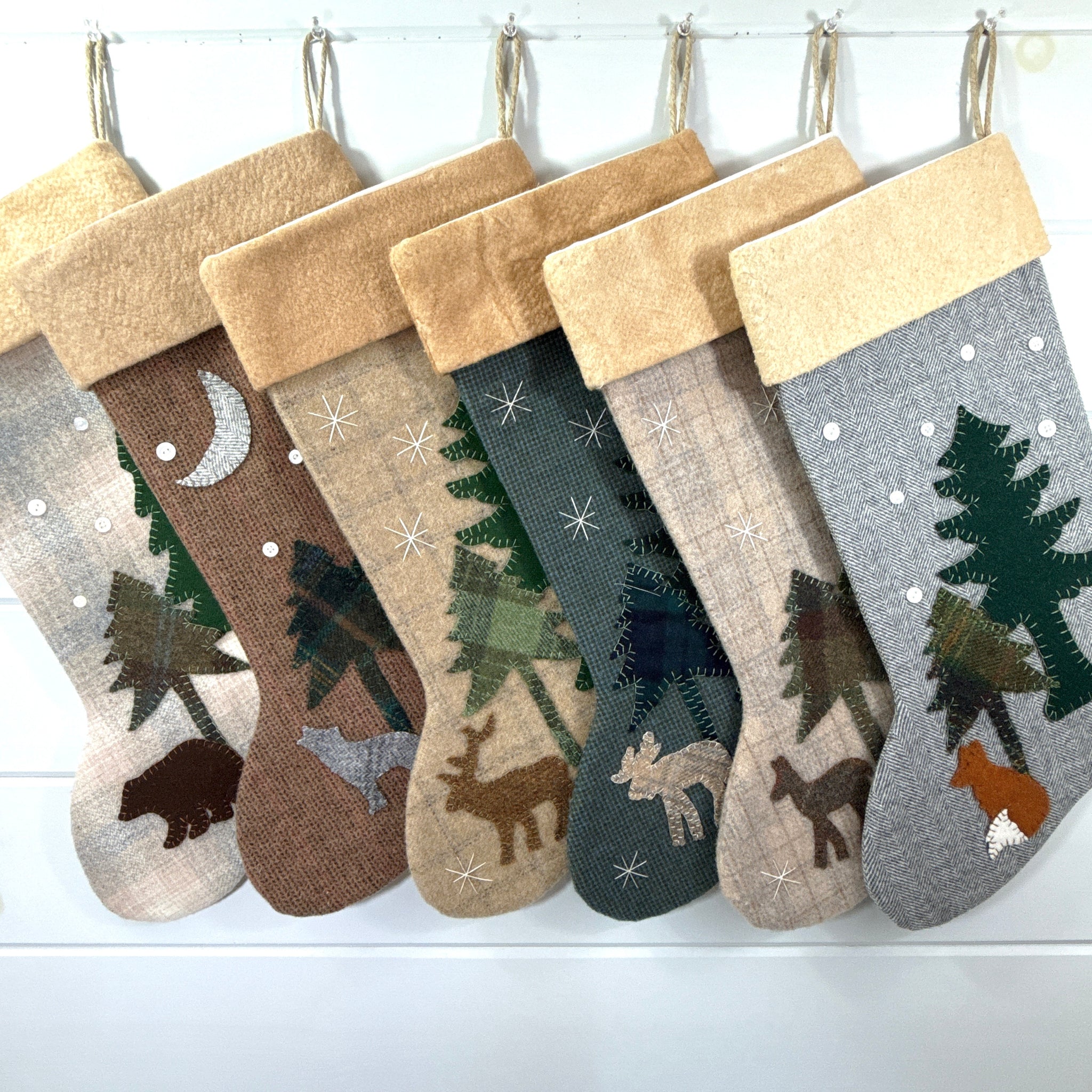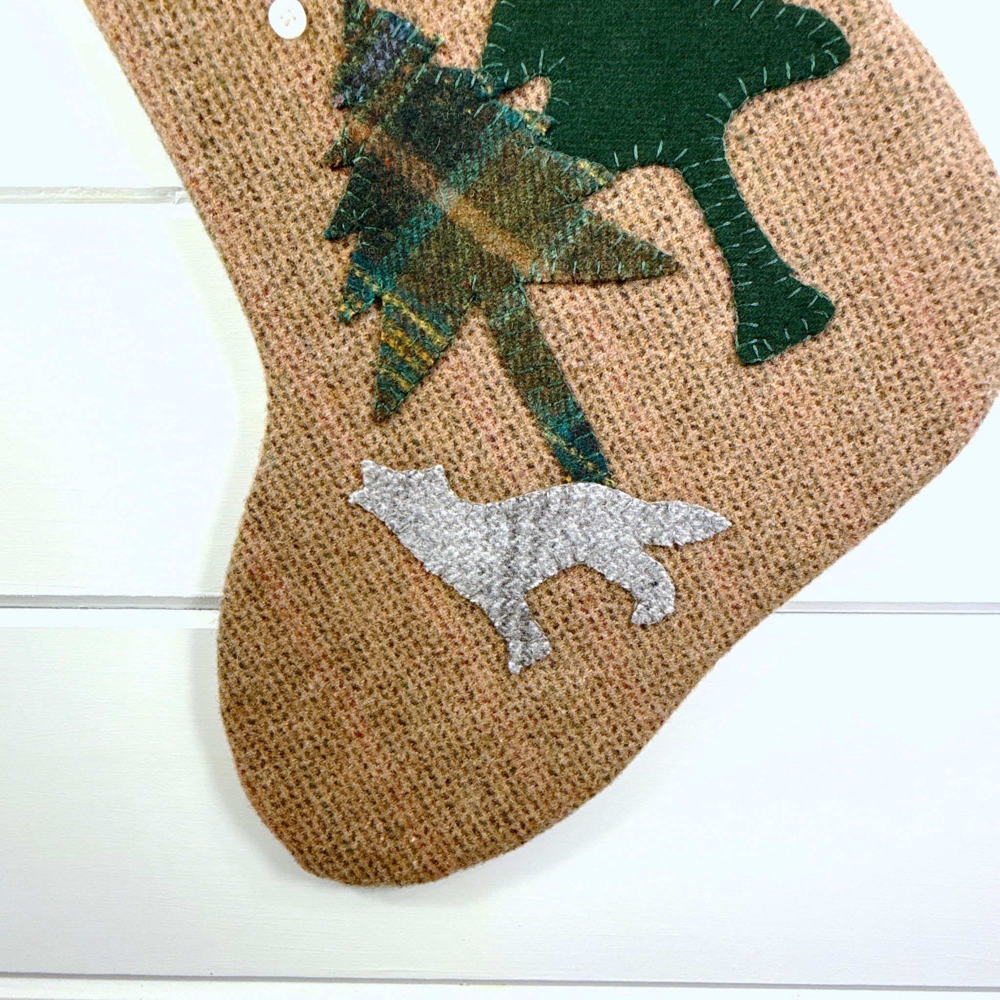 The Wolf Stocking is made from brown and black tweed wool fabric with a light red/pink stripe. The gray wool fabric wolf is standing among the pine trees, which are made of dark green and plaid green wool fabric.